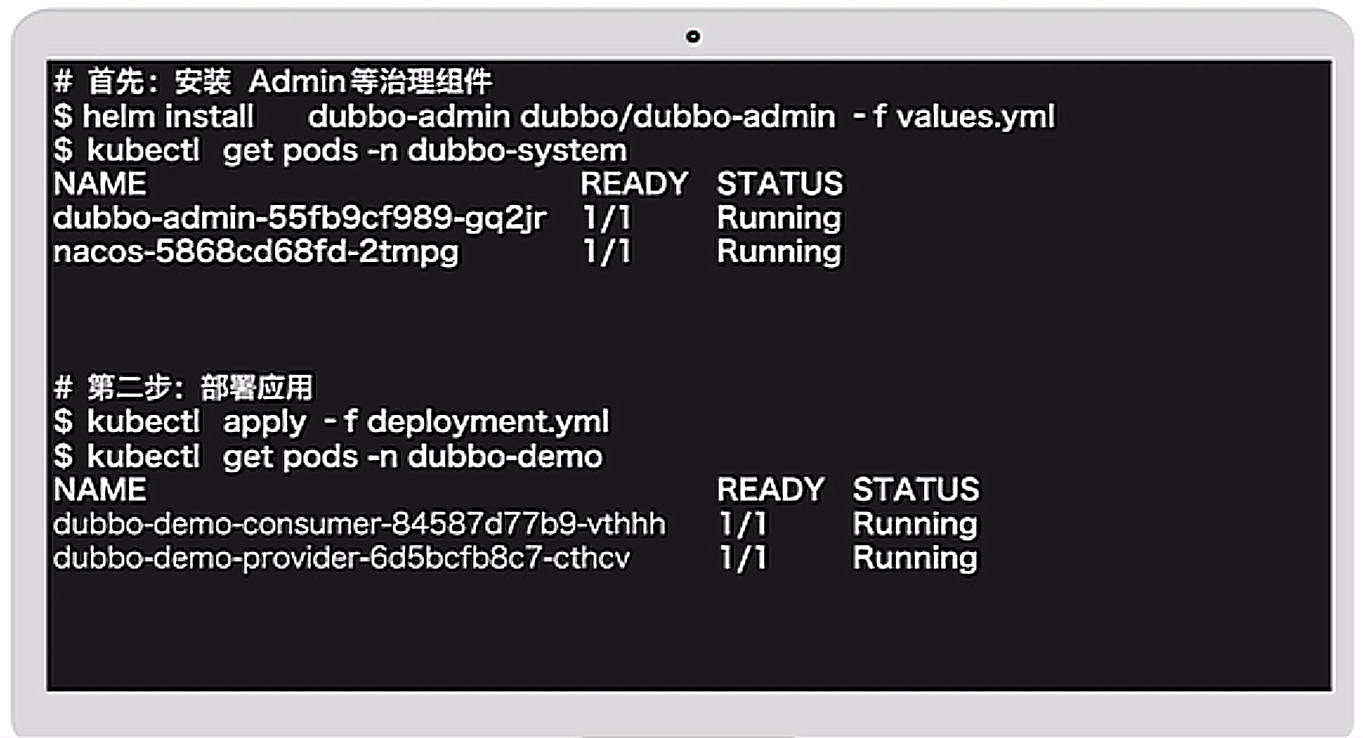 我们选择Kubernetes作为部署环境,首先,通过一条命令安装Dubbo-admin等服务治理组件,安装完成后,我们可以查看部署状态,接下来部署应用,随后查看确认直到应用已经正常运行。