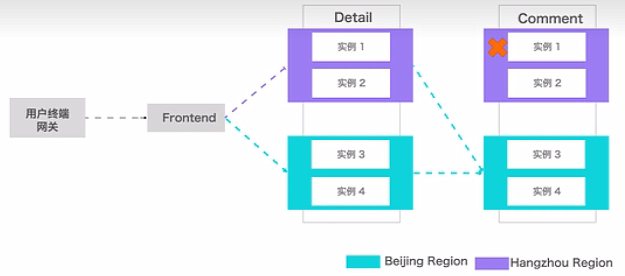 紫色是杭州区域,蓝色是北京区域,部署在紫色区域的应用会优先调用访问同区域的应用,以此降低访问延迟,蓝色区域部署的服务亦是如此。当应用在同区域部署的实例不可用时,调用会自动跨区域切换到其他可用区,以此来确保整体可用性。