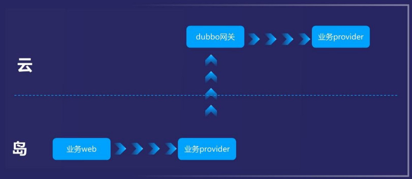 第二个特点,在本地部署业务的 provider 过滤器是运维上的负担。当岛端需要把数据同步 给云端的时候,也就是从岛端的业务 Web 传输到云端的业务 provider。这个时候我必须 在岛端也部署一套业务的 provider 才可以。