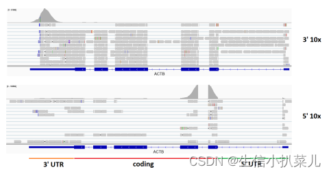 其次,重要的是要注意到,大多数从头测序的基因组的注释方法产生的基因模型不包括UTR序列。3'和5'scRNA-seq方法的读数分布都严重偏向基因的两端(如下图)。因此,使用没有UTR序列的基因注释将极大地扭曲量化和分析的结果。