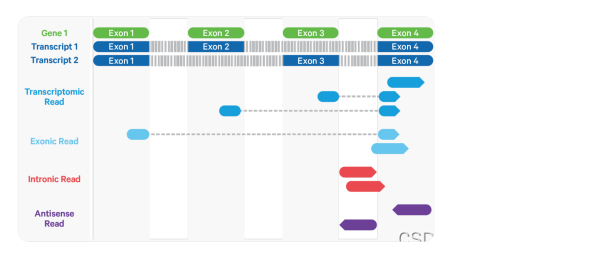 Cell Ranger是处理10x Genomics Chromium scRNAseq数据的默认工具。它使用STAR比对,将 读数与基因组进行拼接感知的比对。之后,它使用转录本注释GTF将reads分成外音、内音和基因间,并通过reads是否与基因组对齐(有把握)来确定。如果一个reads至少有50%与外显子相交,那么它就是外显子;如果它是非外显子并与内含子相交,那么就是内含子;否则就是基因间(如下图)。在reads类型分配之后,对映射质量进行调整:对于与单个外显子基因座对齐但也与1个或多个非外显子基因座对齐的reads,外显子基因座被优先考虑,该reads被认为是有把握地映射到外显子基因座上,并给予最高的比对质量分数。