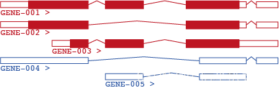 基因组注释过程包括定义基因组的转录区域(基因),以及用外显子-内含子边界注释确切的转录物,并给新定义的特征分配一个类型--如蛋白质编码、非编码等。下面的例子显示了一个由5个转录本组成的基因: 3个蛋白质编码(红色)和两个非编码(蓝色)。基因组注释通常以GTF或GFF3文件格式提供,这些文件是按层次组织的。每个基因由一个独特的基因ID定义;每个转录本由一个独特的转录本ID和它所属的基因定义。外显子、UTR和编码序列又被分配给一个特定的转录本。
