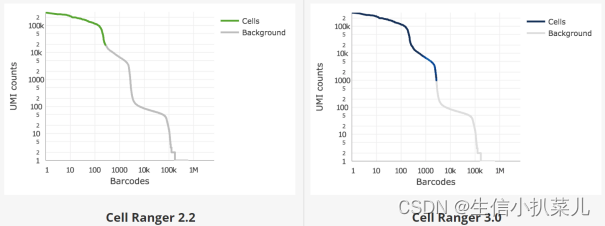 未经过滤的("原始")特征条码矩阵包含许多列,实际上是空的液滴。由于技术上的噪音,例如来自破碎细胞的环境RNA的存在,这些液滴中的基因表达计数不是零。然而,它们通常可以通过存在的RNA的数量与真正的细胞区分开来。在Cell Ranger中,有两种算法实现了这种细胞过滤,我们将其称为 "Cell Ranger 2.2 "和 "Cell Ranger 3.0 "过滤。