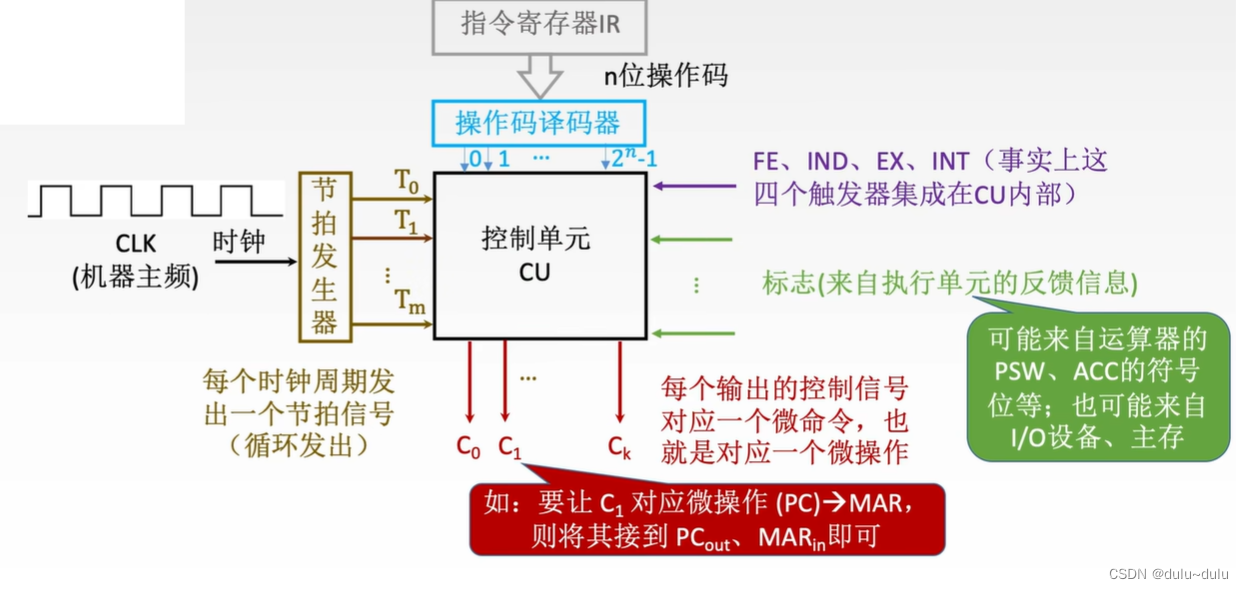 控制单元CU若想发出对应的控制信号,则需要以下信息:指令操作码,目前的机器周期,节拍信号,机器状态条件,根据这些信息,CU就能确定在这个节拍下应该发出哪些"微命令",也就是这个节拍下应该进行哪些"微操作"。