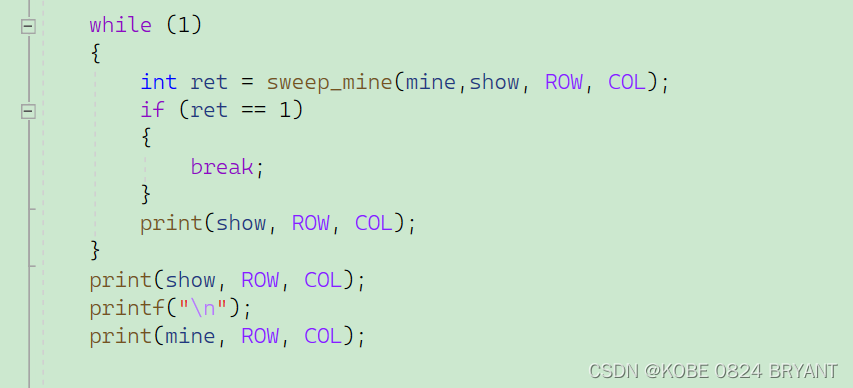 可以看到,sweep_mine前面由一个int类型的变量ret接收,后面紧接着是if语句判断,因为从上面的扫雷代码可以知道如果返回值是1的话,要么是扫雷成功了,要么是被炸死了,也就是说游戏结束了。