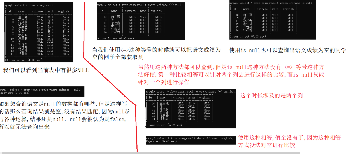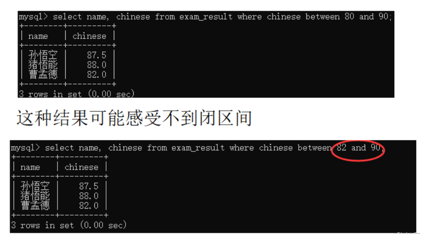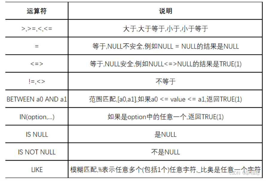 -- (1)比较运算符 (2)BETWEEN ... AND ... (3)IN (4)IS NULL (5)LIKE (6)AND (7)OR