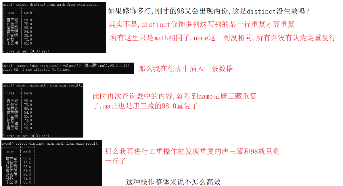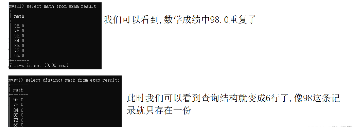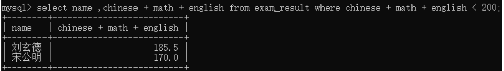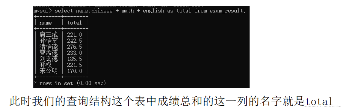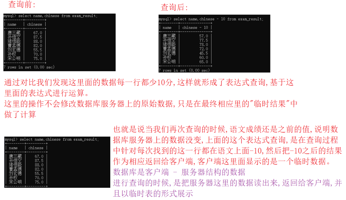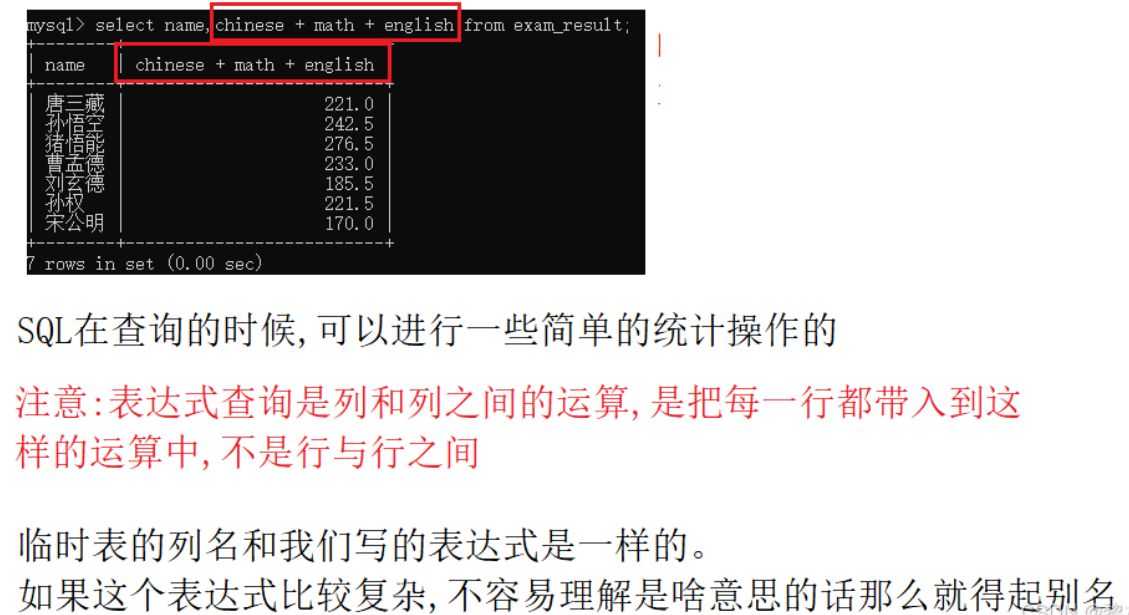 一边查询,一边进行计算,在查询的时候,写作由列名构成的表达式,把这一列中的所有行都带入到表达式中,参与运算。