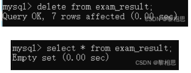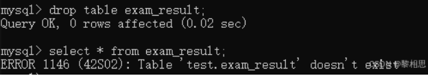 删除整个表的记录和前面的drop table还不太一样,drop table是把表删了,同时也删除了表里的记录,而这里的delete操作是只删除了表里的记录,但是表还在,只不过变成了空表。所以我们可以看到前面可以正确的去查询。
