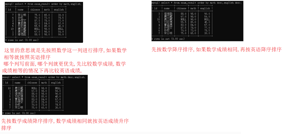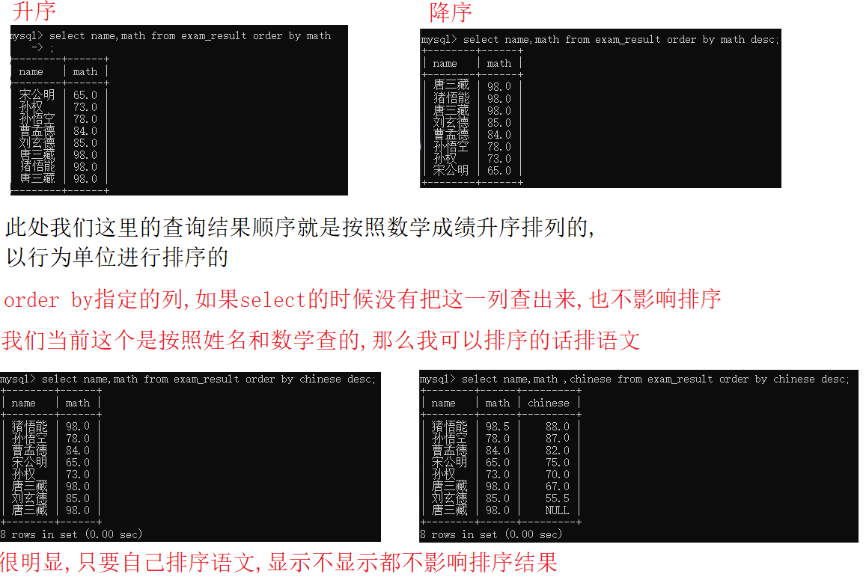 //asc -- 升序排序 desc -- 降序排序 如果省略不写,默认升序排序