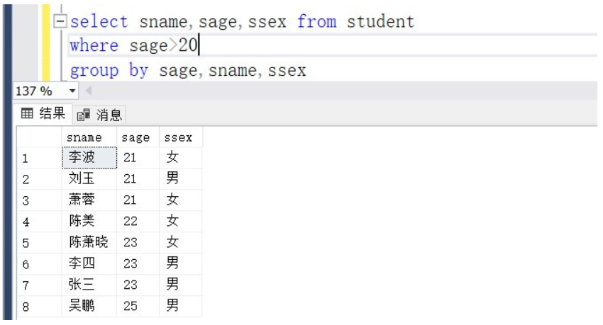 分组后的数据与分组前的数据相比,分组后的数据是先以sage开始从小到大排序的,然后在以sname的中文首字母从a到z开始排序的,最后在以ssex的中文首字母从a到z开始排序的。