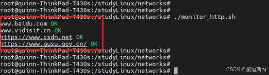 URL_LIST=("www.baidu.com" "www.vidisit.cn" "https://www.csdn.net" "https://www.gusu.gov.cn/"):定义了一个名为URL_LIST的数组,其中包含要检查的多个URL地址。