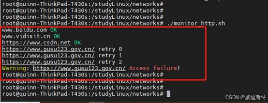 如果经过三次尝试之后,仍然没有成功(即FAIL_COUNT等于3),则打印出警告信息:“Warning: $URL Access failure!”