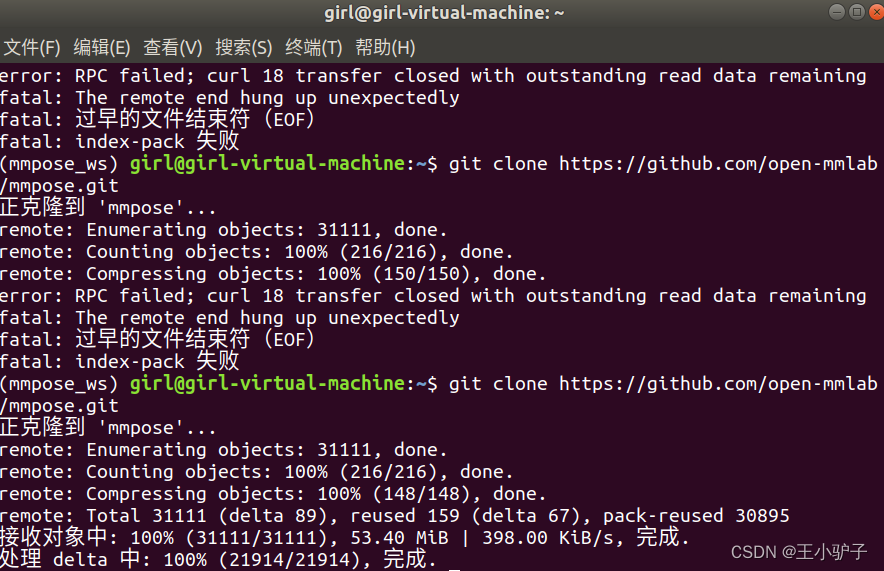 【注意】github国内不稳定,要是failed了就多执行几遍,或者挂梯子,或者等一会再执行。多执行和等一会是最简单粗暴且有效的,等不起可以复制error去网上找一些高端方法(涉及网络通信等)