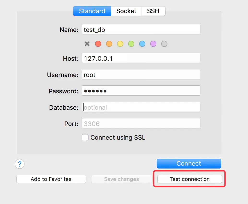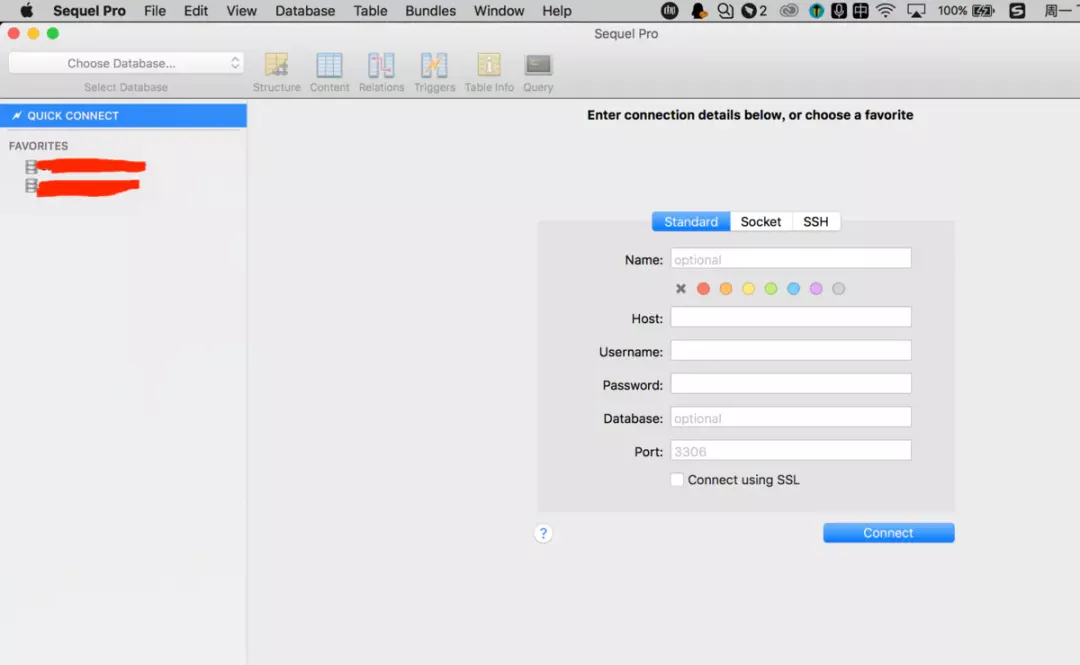 Sequel Pro 提供了 3 种连接方式,standard/socket/ssh。