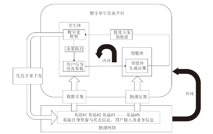 在每一轮仿真中,孪生体根据模拟的场景进行参数配置,运行获得每个节点和用户的数据,并将这些数据作为智能体的输入;智能体处理孪生体送入的仿真结果,综合用户行为、业务需求、网络性能及其他场景中生成的针对孪生体的优化策略,在下一轮仿真中应用新的参数配置,以此形成图1中的内环,经反复迭代后生成动态场景下最优的系统配置[17]。