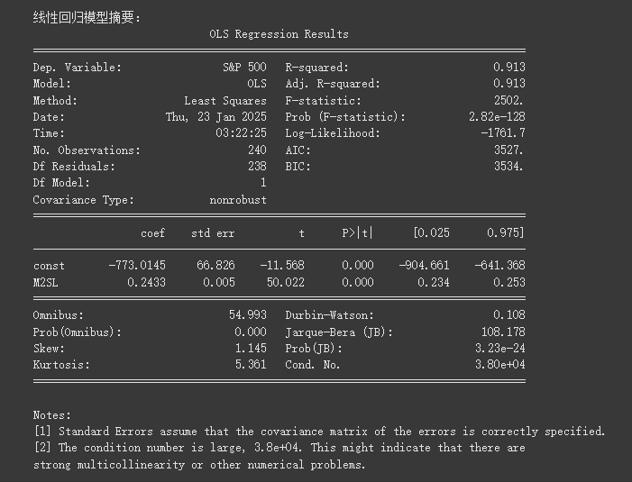 - R-squared(0.913):这表明,M2 货币供应量可以解释标准普尔 500 指数约 91.3% 的变化。这是一种非常强的关系,表明 M2 对标准普尔 500 指数的走势有重大影响。