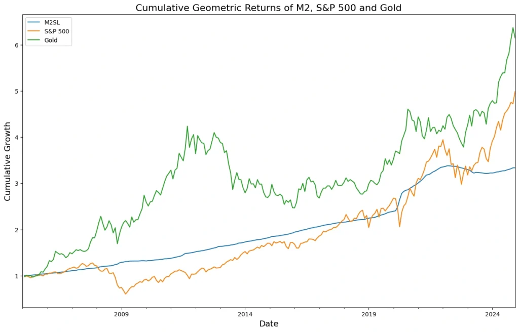 如果你仔细观察数据,就会发现标准普尔500指数的走势与M2货币供应量高度同步,唯一的显著背离发生在2008-2010年的次贷危机期间。至于黄金,其价值虽然整体呈现稳步上升趋势,但当其回报率与M2的增长偏离过大时,往往会回调并重新恢复平衡状态。