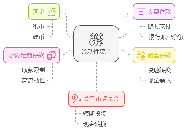 - 货币市场基金:一些短期投资工具,通常可以在短时间内转换为现金。