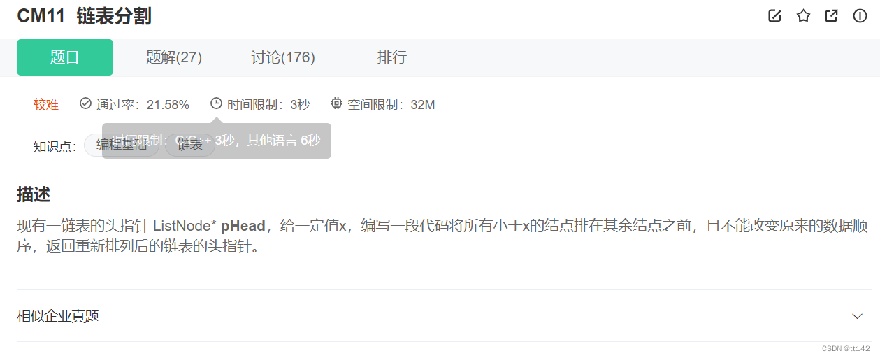 其实写完这个题感觉和上一个简直一模一样啊,只不过这次的题目链表只有一个,但是要创建两个新的哨兵位,一个保存比所给值x更小的节点,更一个保存>=的