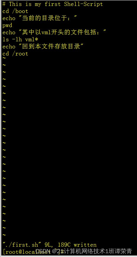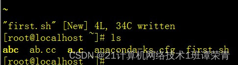 (wq存盘后,ls确认当前目录(/root)有first.sh)