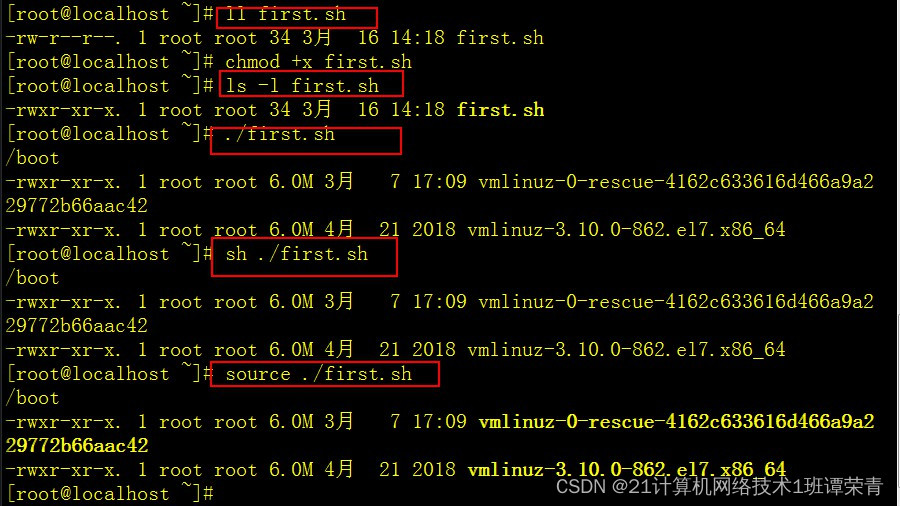 [root@localhost ~]# chmod +x first.sh(+x前不写用户或组,默认所有人都给X权)