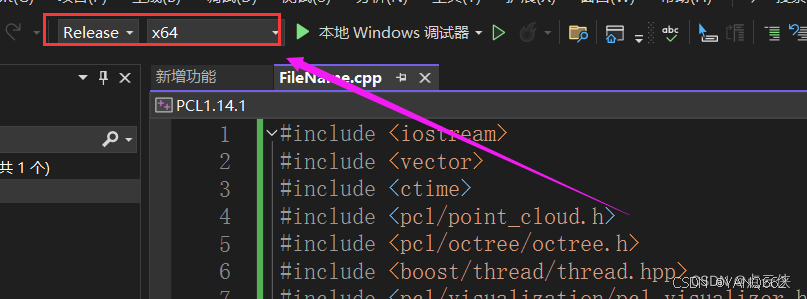 解决方案配置选择,解决方案平台选择x64。