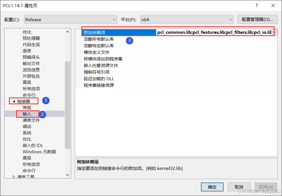 4.4 链接器—输入—附加依赖项——添加PCL和VTK的相关lib文件。