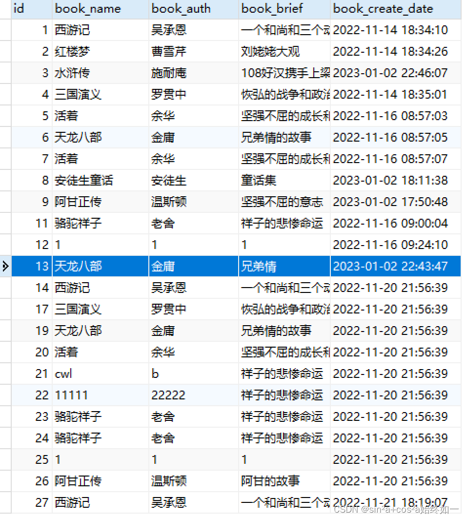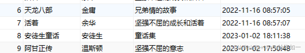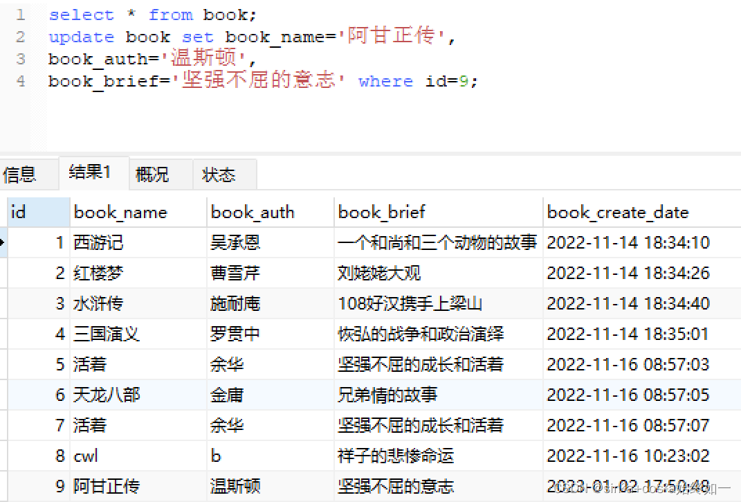 update book set book_name='阿甘正传',book_auth='温斯顿',book_brief='坚强不屈的意志' where id=9;