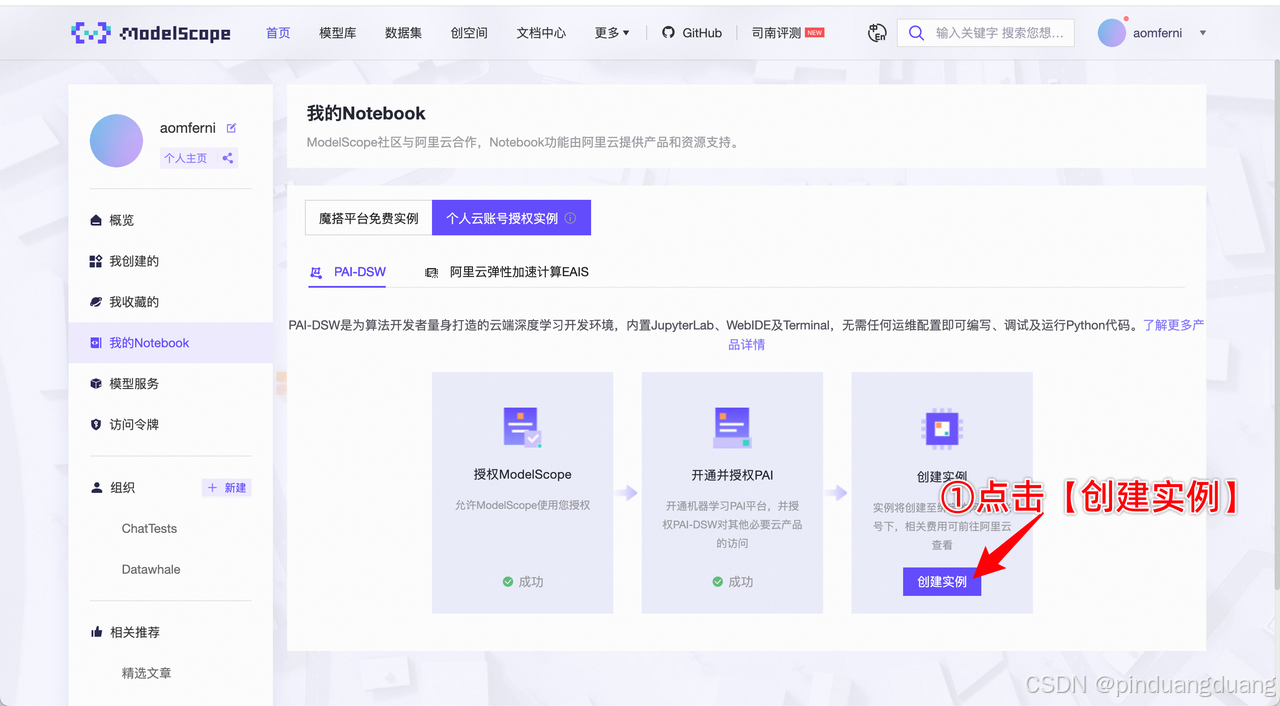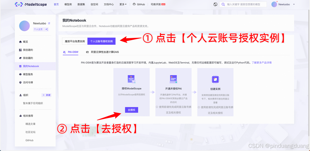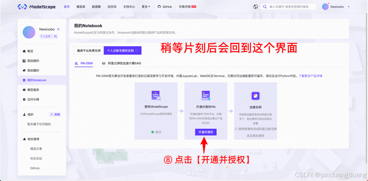 2.在魔搭社区进行授权 https://www.modelscope.cn/my/mynotebook/authorization