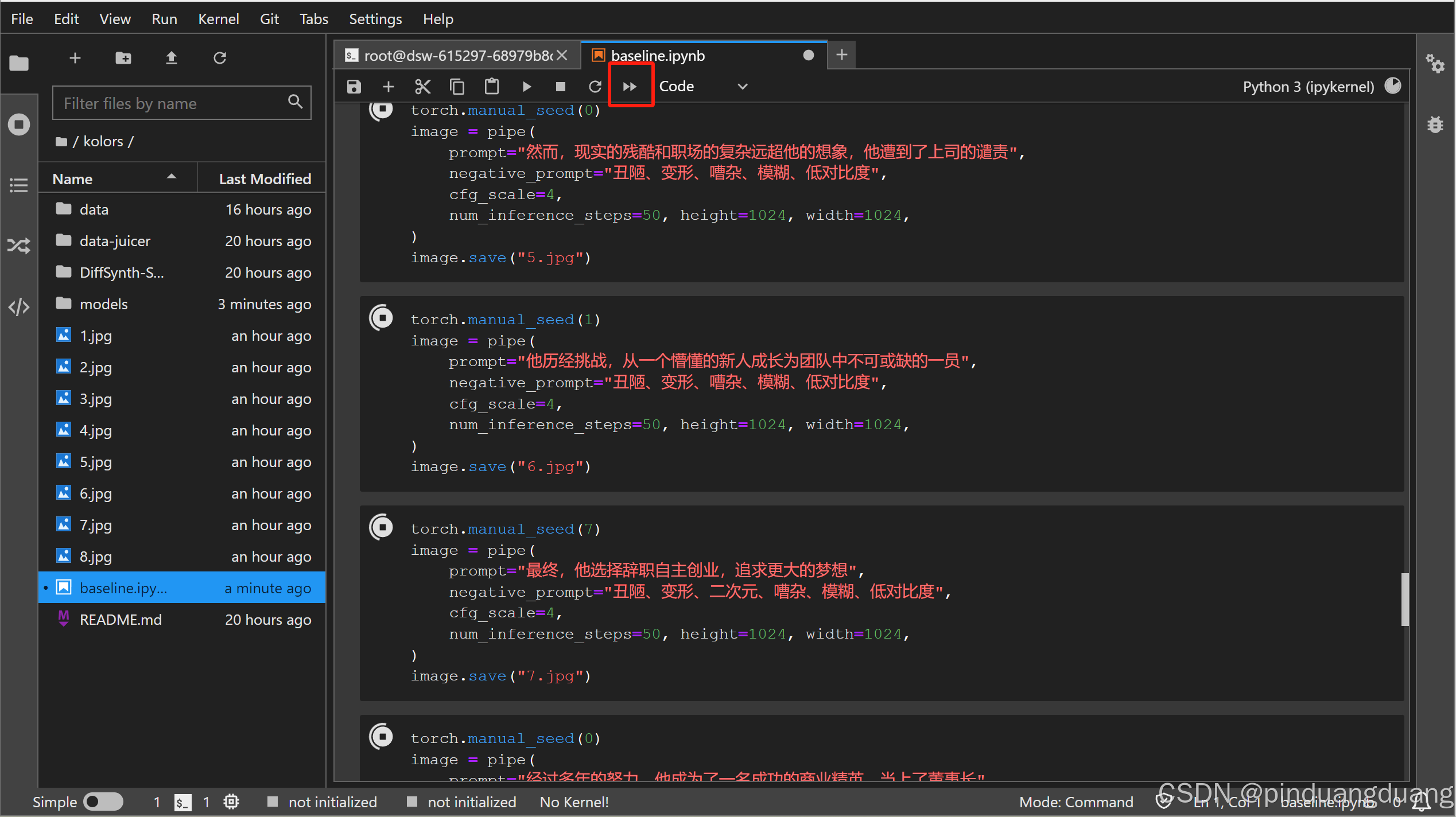 5.下滑到生成图像代码部分,依次调整8张图片的prompt和negative_prompt,使生成的图片达到自己想要的效果