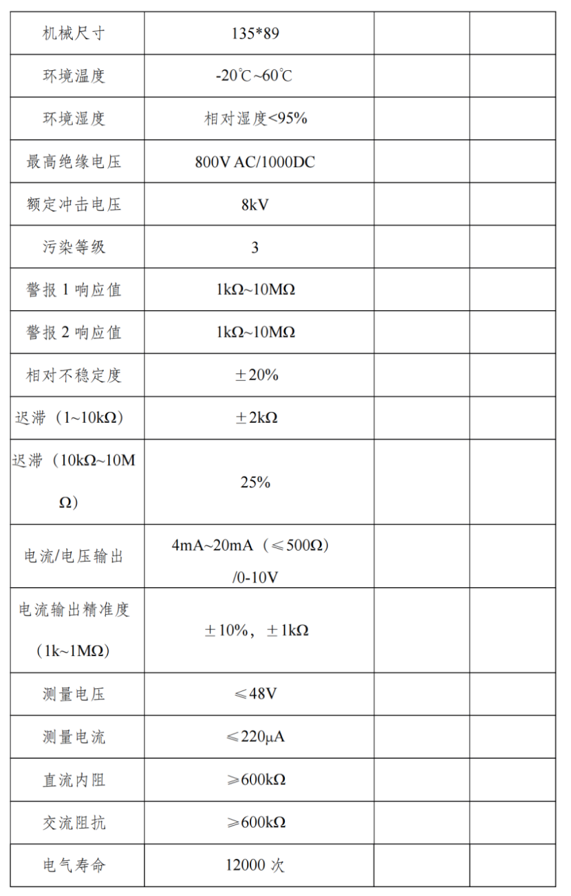 远程监控:RS-485 接口 + Modbus-RTU 协议,可远程读取绝缘电阻(0x53 地址,单位 0.1KΩ)、系统状态(0x52 地址:正常 / 待机 / 自检)、报警状态,中控室实时监控;