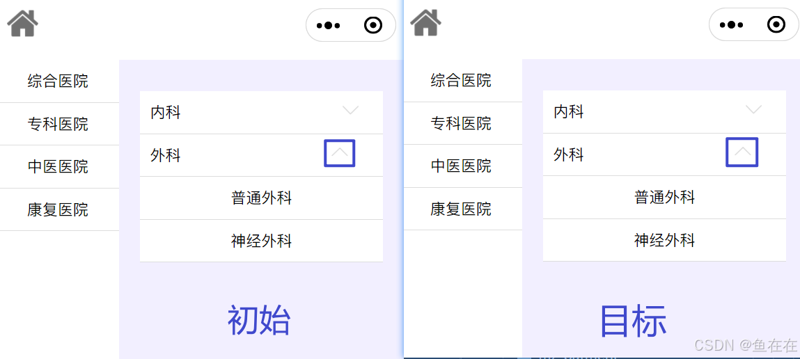 微信小程序-分级菜单-下拉条 图标选中状态 简单说明一下item.name 是一级的testList 已经被wx:for 一遍了,item 相当于当前层的children。一开始想到用伪类去做,发现所有附有class 成员都变了... 直接懵了,目标是只有当前点击这个成员的图标变就行了。仔细可以看到wxml我的image组件中定义了点击事件和传递的唯一id。我也意识到这是很笨的方法,也太直肠子了... 哈哈 ,但是目前还没有更好的思路!声明:一下也许不是最好的方法,本人今年还是一个学生,仅供参考,欢迎评论改正!这个二级成员定义如下,比如内外科那里!