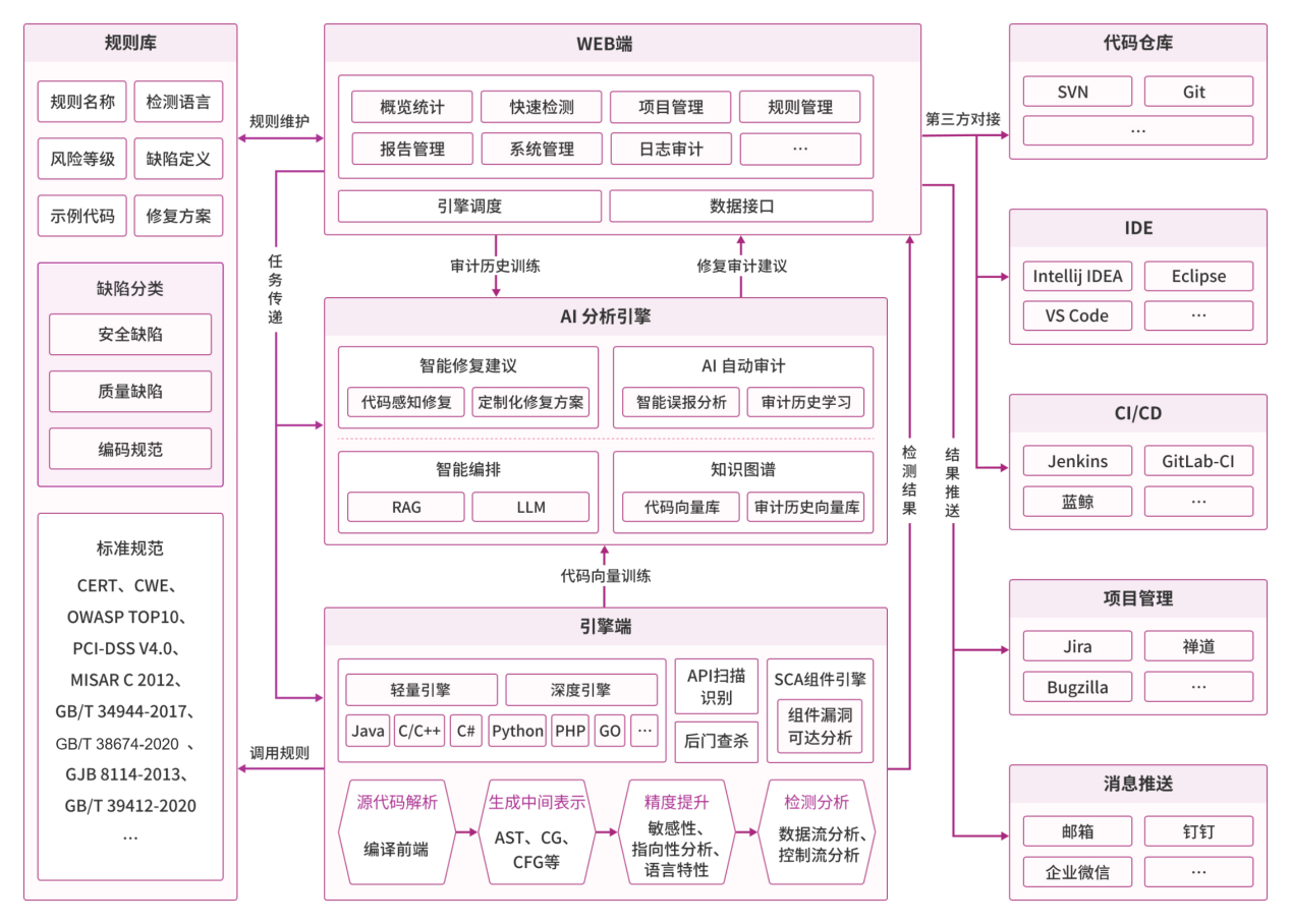 误报、漏报消减:深入理解代码的全局上下文,准确分析跨文件、跨函数的依赖关系;通过收集和学习新的代码样本、历史缺陷数据和误报案例,不断优化检测准确度,更精确地识别真实缺陷、缓解误报。