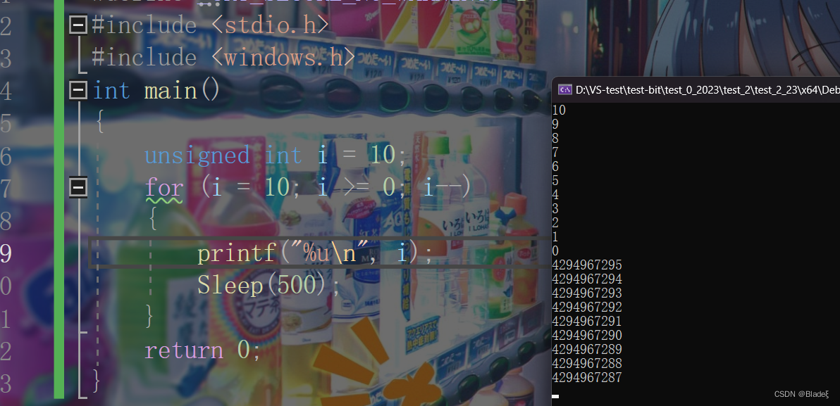 循环会执行多少次呢? int main() { unsigned int i = 10; for (i = 10; i >= 0; i--) { printf("呵呵\n"); } return 0; }1