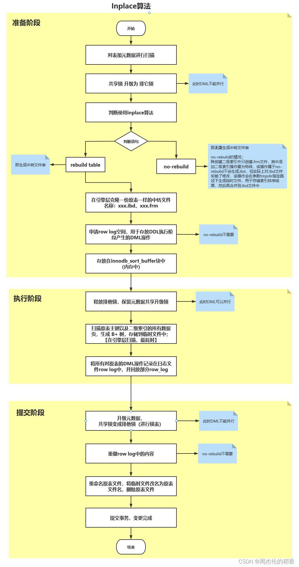 - Inplace算法指的是直接在原表上进行结构修改,不创建新表。这个算法的优点是不需要额外的存储空间,但可能会产生较大的锁、阻塞和性能开销。