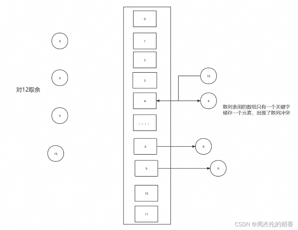 例:如下图我们依次将这些数对 12取余,将这些数添加到对应的关键字里,但是当我们添加16时,我们发现,16和4在散列表的位置冲突了,我们必须给16安排到别的位置去。