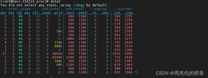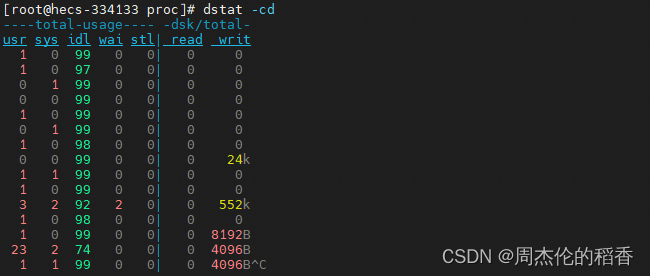 dstat以秒级乃至更短的时间间隔持续刷新显示数据,确保用户能够及时捕捉到系统状态的变化。这对于快速响应性能波动或故障排查尤其重要。 - 易用性:其简洁的命令行界面使得即使非专业用户也能快速上手。通过简单的命令选项,可以轻松调整输出格式、采样频率、显示列数等。