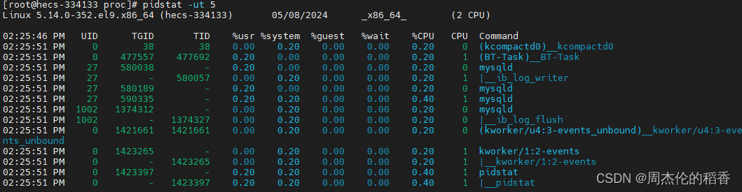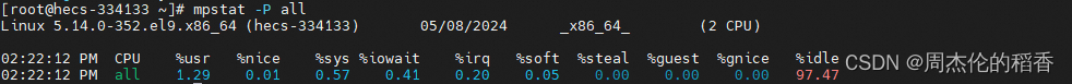 %usr: 用户态CPU时间百分比,即执行用户进程所花费的时间。%nice: 低优先级(nice)用户进程所占CPU时间百分比。%sys: 系统态CPU时间百分比,即执行内核进程所花费的时间。%iowait: 等待I/O操作完成时CPU空闲时间百分比。%irq: 处理硬件中断所占CPU时间百分比。%soft: 处理软件中断(包括内核调度等)所占CPU时间百分比。%steal: 在虚拟化环境中,被其他虚拟机“偷走”的CPU时间百分比。%guest: 执行虚拟机所占CPU时间百分比(如果支持)。%idle: CPU空闲时间百分比。- 其他选项: