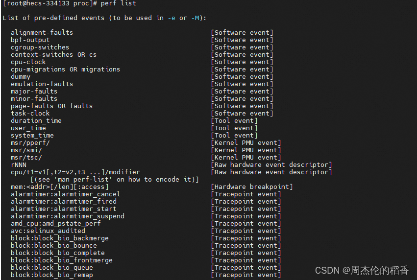 - perf list:列出当前系统支持的所有性能事件,包括硬件计数器事件、软件事件(tracepoints)、以及由 perf_events 驱动提供的其他事件。这对于选择合适的事件进行性能分析非常有用。
