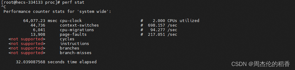 - perf stat:用于快速获取指定命令或进程的整体性能统计数据。它会在命令执行前后采样,并报告诸如 CPU 时间、缓存命中率、指令数、上下文切换等各项指标。