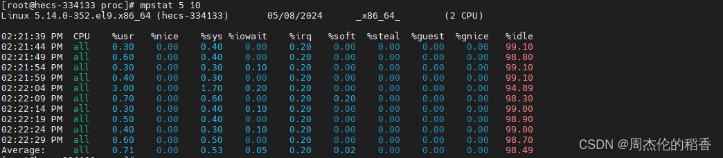 mpstat默认不带任何参数时,会显示系统启动以来CPU的统计信息。若要观察实时变化,可以指定采样间隔和采样次数,如: