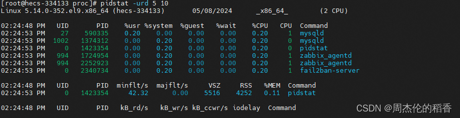 上述命令每5秒采样一次,连续采样10次,显示指定进程的CPU使用(-u)、内存使用(-r)以及磁盘I/O(-d)情况。