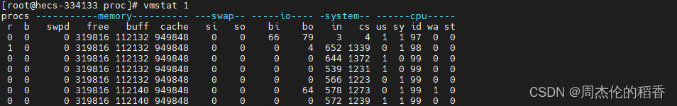 swpd:虚拟内存中使用的交换空间大小。free:可用物理内存大小。buff:用于文件系统缓存的缓冲区大小。cache:用于文件系统缓存的高速缓存大小。- 在某些系统上,