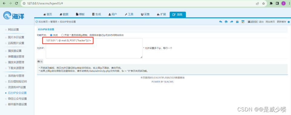Through testing, it was found that there is a remote code execution vulnerability in/augap/adminip.php, which allows attackers to insert malicious code into the input box and execute it through the backend IP security settings