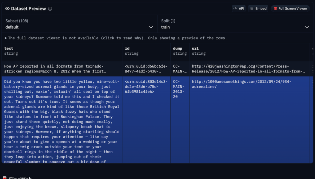 如果你对经过预处理的数据集感兴趣,FineWeb提供了一个整理后的Common Crawl版本,并已在Hugging Face上公开可用。