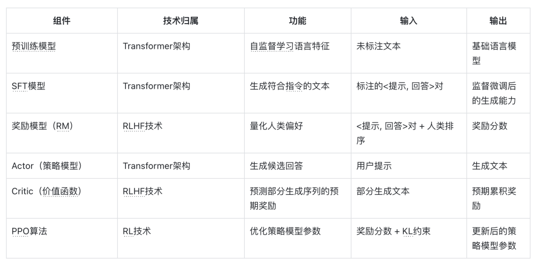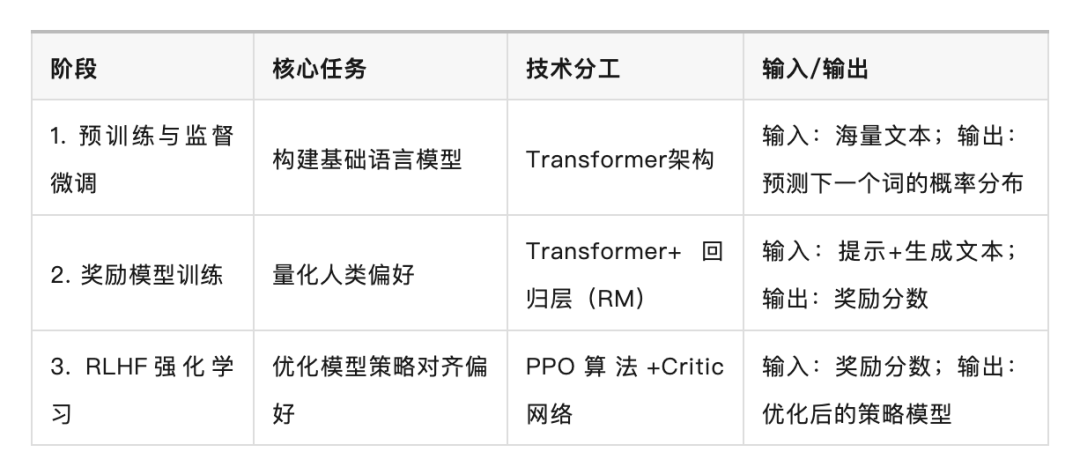 4)技术分工:◦ Transformer作为特征提取器,RM通过强化学习框架学习人类偏好模式。