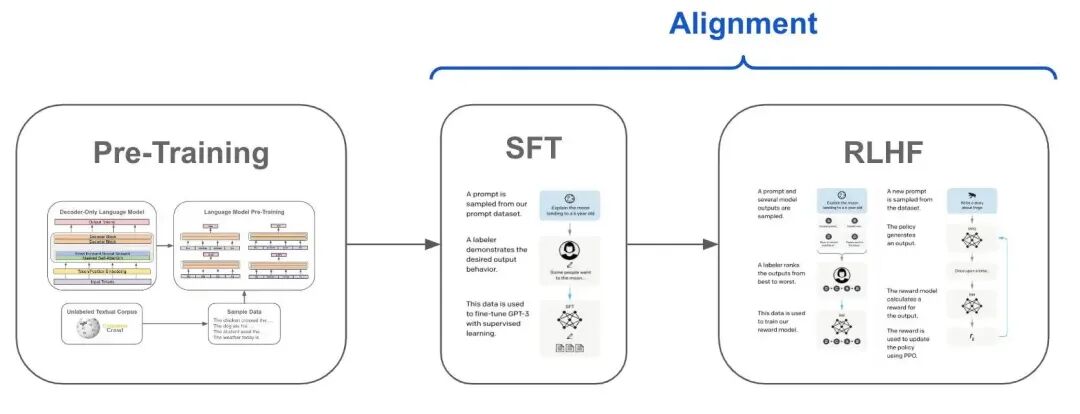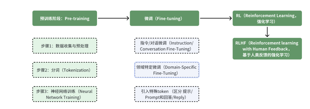 上述流程整合了预训练、微调、RLHF等核心阶段,适用于自然语言处理和多模态大模型:
