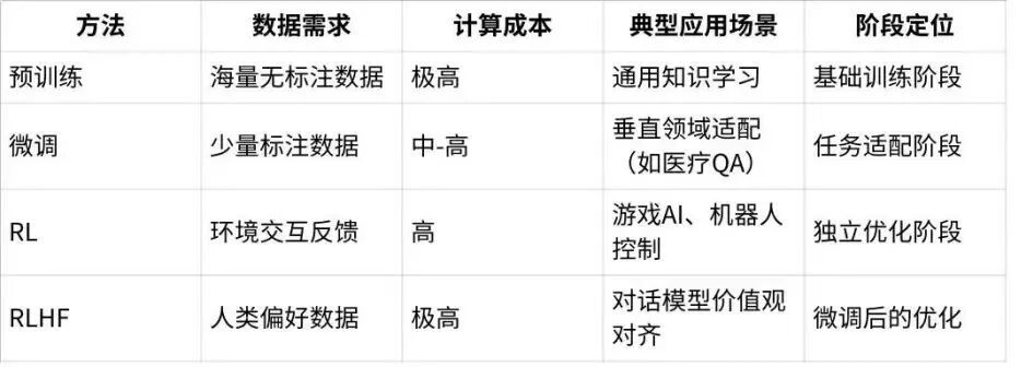 与微调的区别:RL不依赖标注数据,而是通过试错学习,这个能力也是为什么AI大模型有创新的关键,因为RL会让大模型发现人类难以发现的数据之间的规律,实现创新;微调依赖静态标注数据集。