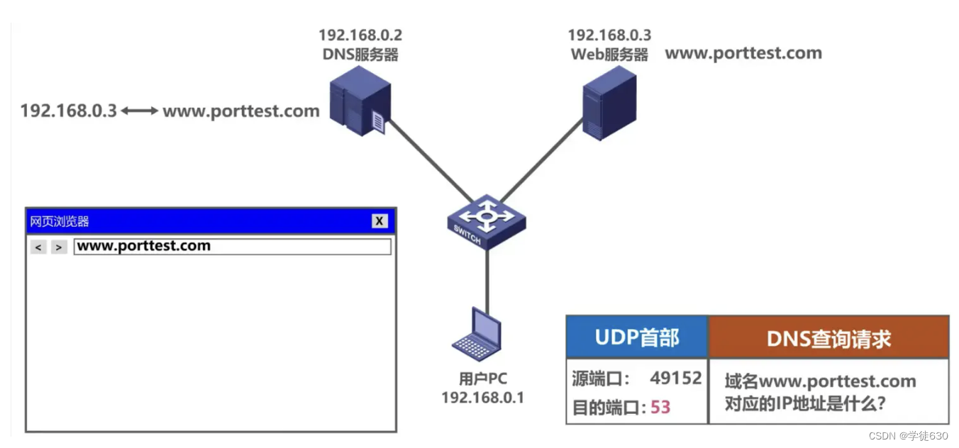 UDP首部中的目的端口号为53,这表明应将该UDP用户数据报的数据载荷部分,也就是DNS查询请求报文,交付给本服务器中的DNS服务器端进程