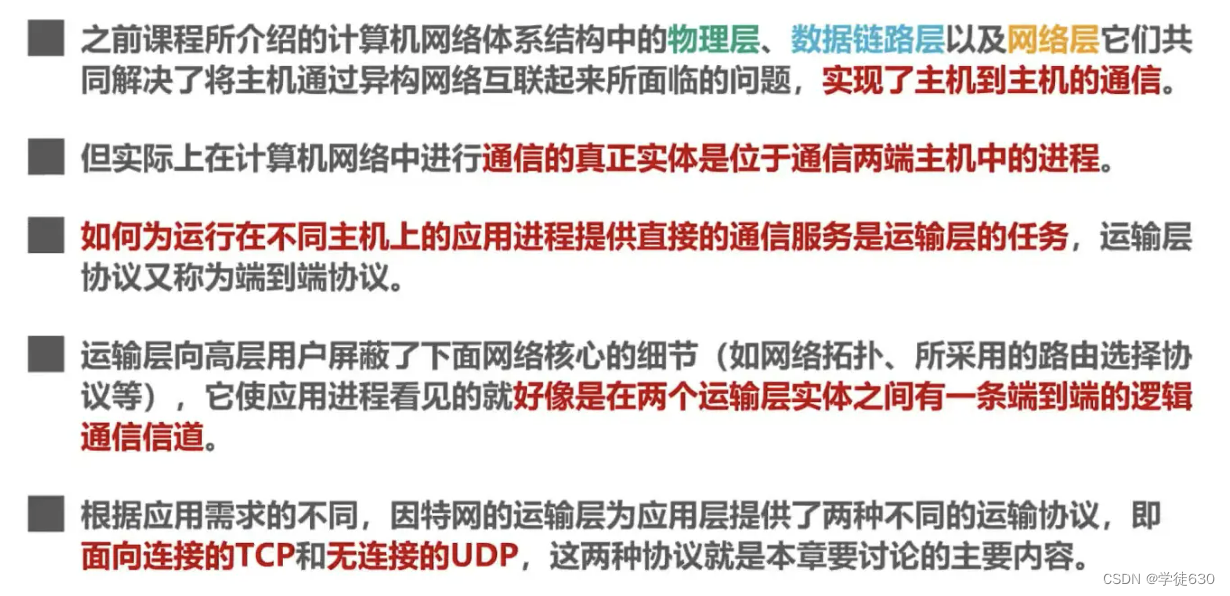 从通信和信息处理的角度看,运输层向它上面的应用层提供通信服务,它属于面向通信部分的最高层,同时也是用户功能中的最低层。